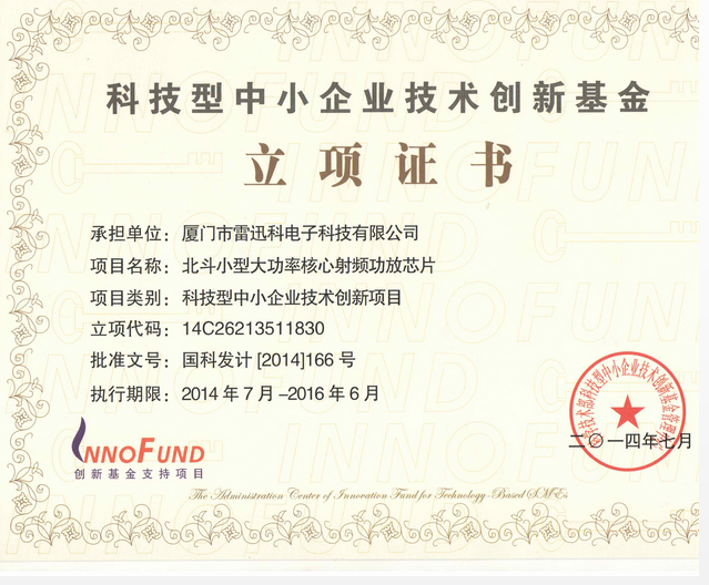 北斗芯片獲得了國家科技型中小企業(yè)技術(shù)創(chuàng)新項(xiàng)目,立項(xiàng)代碼:14C26213511830,批準(zhǔn)文號:國科發(fā)計(jì)[2014]166號。